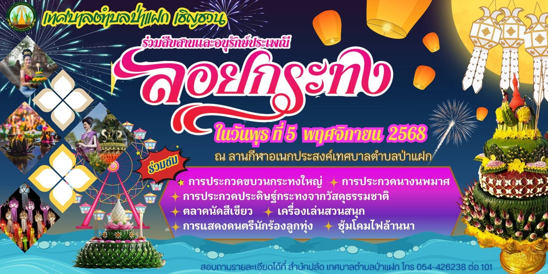ประชาสัมพันธ์ เชิญชวนร่วมสืบสานและส่งเสริมประเพณีลอยกระทง วันพุธที่ 5 พฤศจิกายน 2568 วันเพ็ญเดือน 12 วันลอยกระทง ณ ลานกีฬาอเนกประสงค์เทศบาลตำบลป่าแฝก พร้อมกิจกรรมมากมาย
