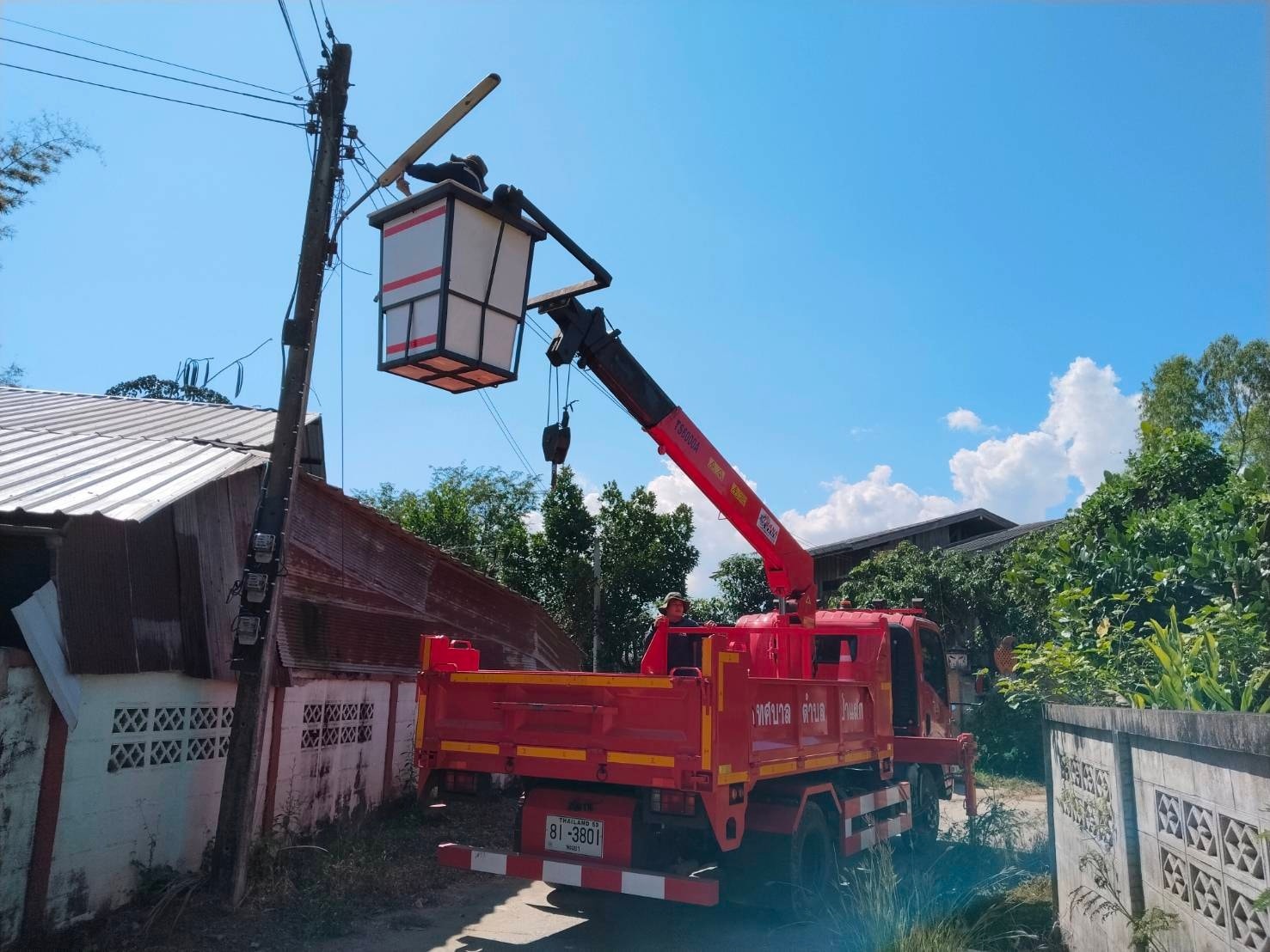วันที่ 15 กันยายน 2568 กองช่าง ทต.ป่าแฝก ซ่อมแซมไฟฟ้าสาธารณะ (ไฟกิ่ง) ในพื้นที่ ม.1,5,9